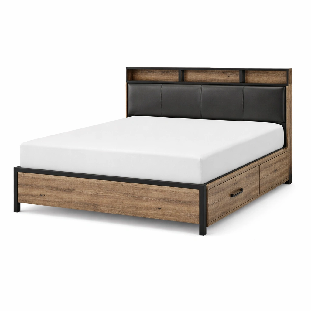 Cama con almacenamiento de MDF y cuero sintético