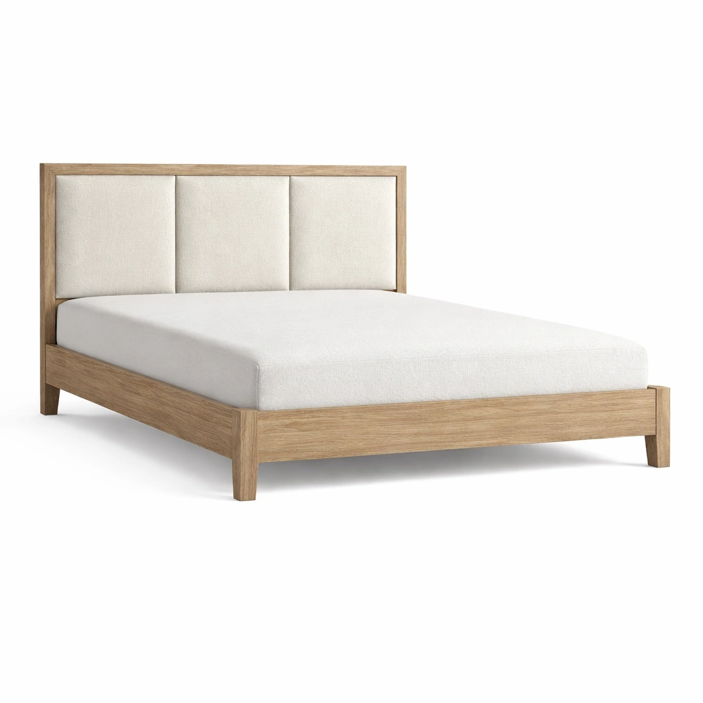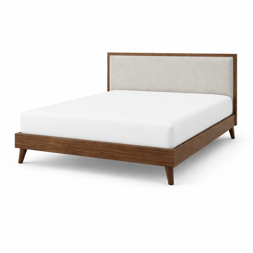 Estructura de cama doble de madera de nogal con cabecero de tela beige