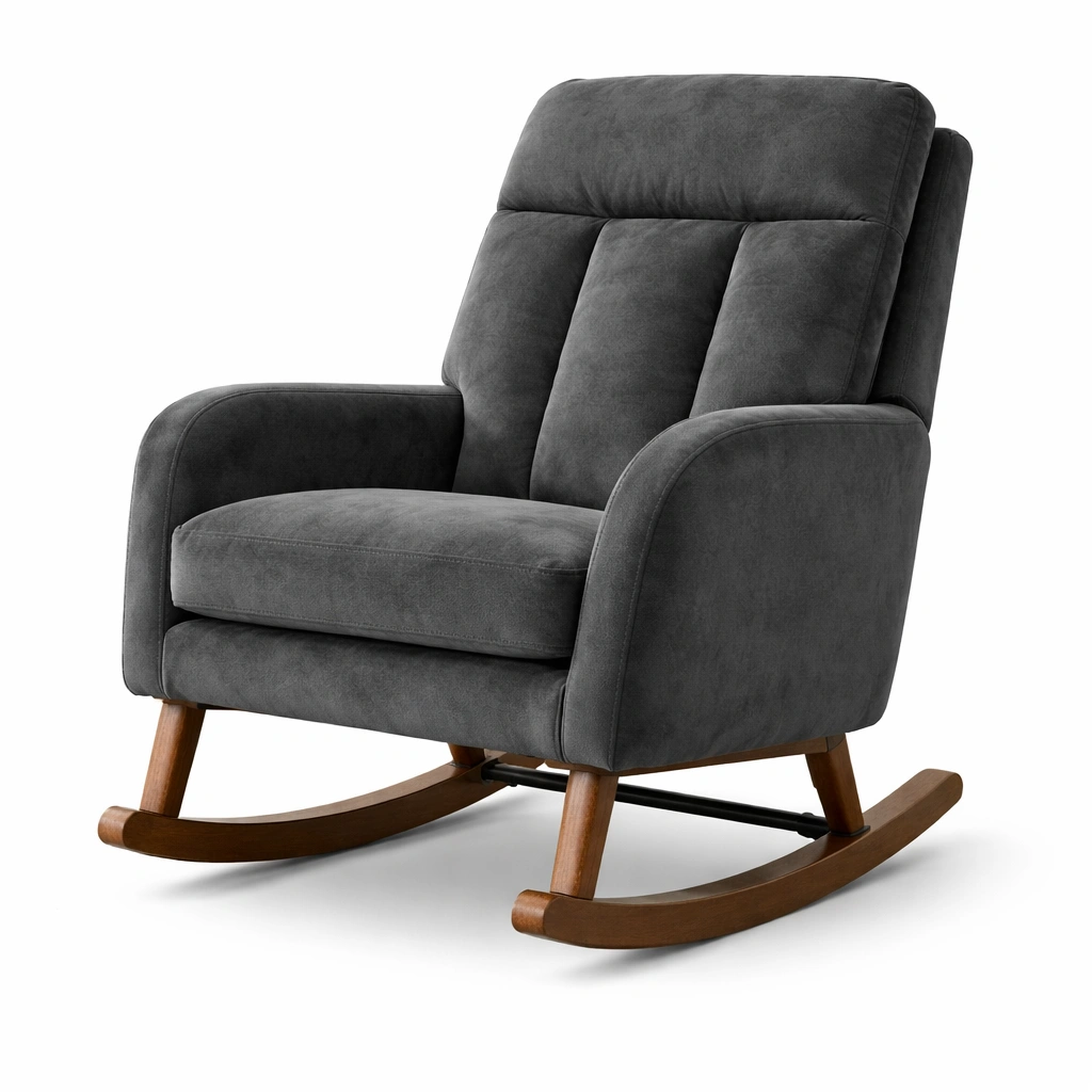 Silla mecedora de tela gris oscuro con base de madera