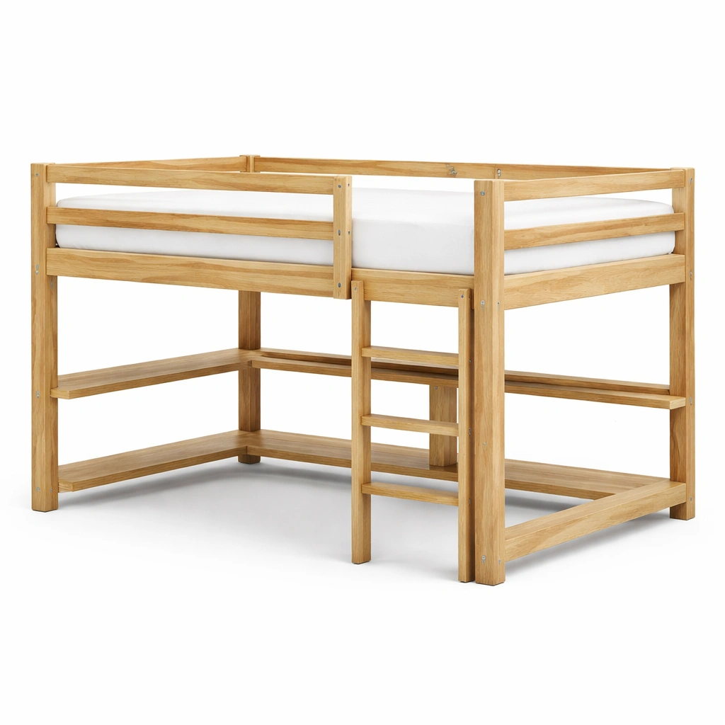 Esta cama alta está hecha de madera de pino maciza y presenta un área de estudio integrada en la parte inferior. Las dimensiones son de 200 cm de largo, 90 cm de ancho y 110 cm de alto. El color es Natural. Soporta un peso máximo de 100 kg. Es adecuada para niños a partir de 6 años. La escalera está ubicada frontalmente.