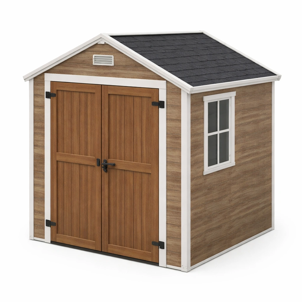 Este cobertizo de jardín está compuesto por un exterior de polipropileno resistente y un soporte estructural interno de acero. El principal color es Marrón con detalles secundarios en Blanco. Las dimensiones son 196 cm de longitud, 152 cm de ancho y 208 cm de altura.